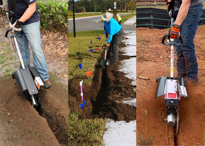 Versatile, portable trencher designed for fast installations. Its lightweight design and portability make it easy to transport. Its powerful 1.9HP engine and carbide tip excavating blades offer full authority to dig up to 12" through the toughest soils and roots.